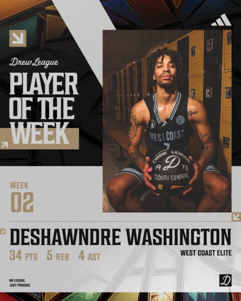 DESHAWNDRE WASHINGTON NAMED WEEK 2 PLAYER OF THE WEEK June 10, 2024 In the first two weeks of the 2024 Drew League season, one of the standout teams so far has been West Coast Elite. The fast-running young team is 2-0 after defeating Cititeam Blazers on Saturday, 88-77. 6’7 guard Deshawndre Washington was an all-around factor in both wins, but stepped up his scoring tremendously in the second game, putting up 34 points in addition to his 5 rebounds, 4 assists, and 2 blocks.Â